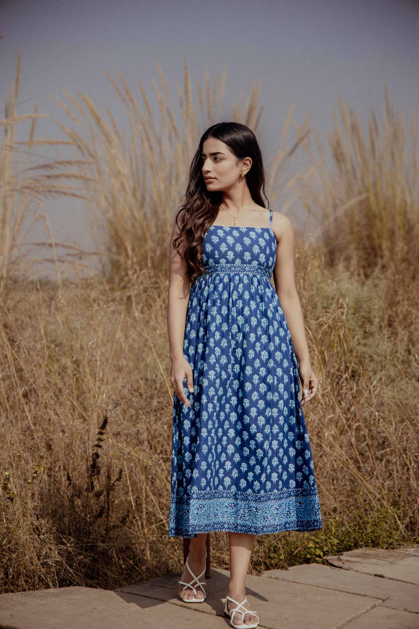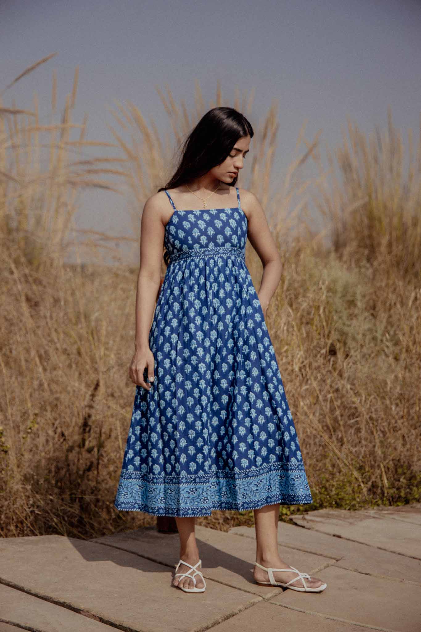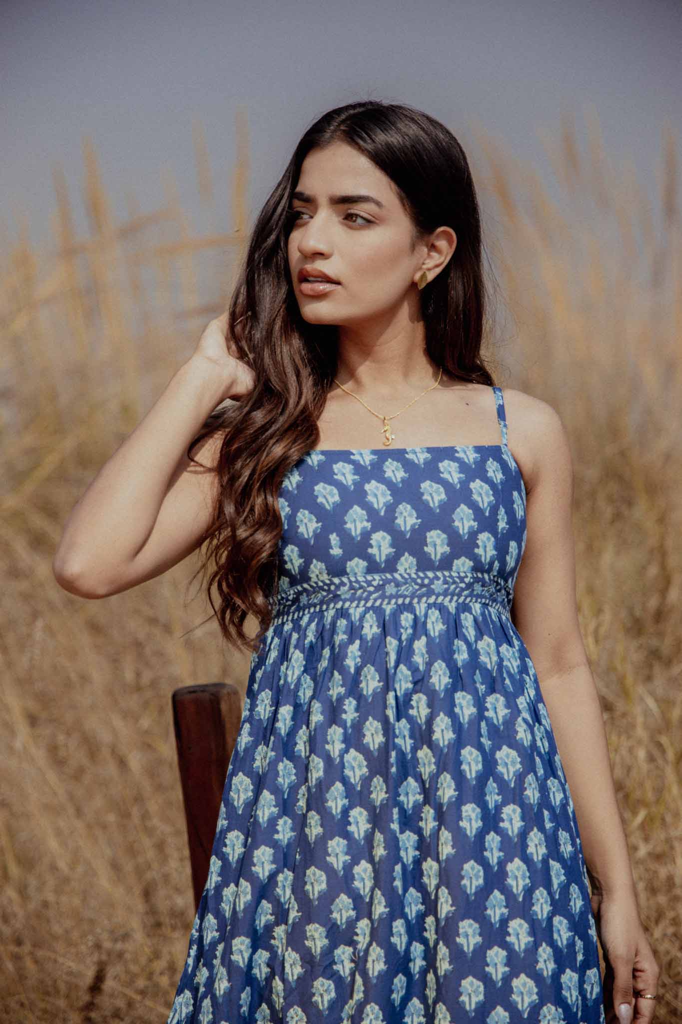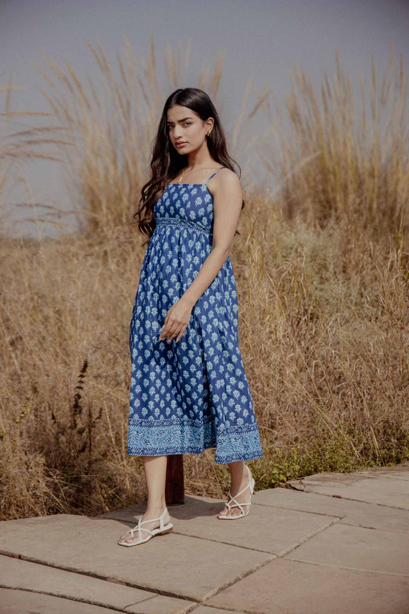 Calm, breezy, and effortlessly elegant — Snowberry is a handmade midi dress crafted for warm days and unhurried moments. Made in breathable cotton, this piece features a deep blue base adorned with delicate hand block floral motifs, finished with a contrasting printed border that adds quiet character and charm.