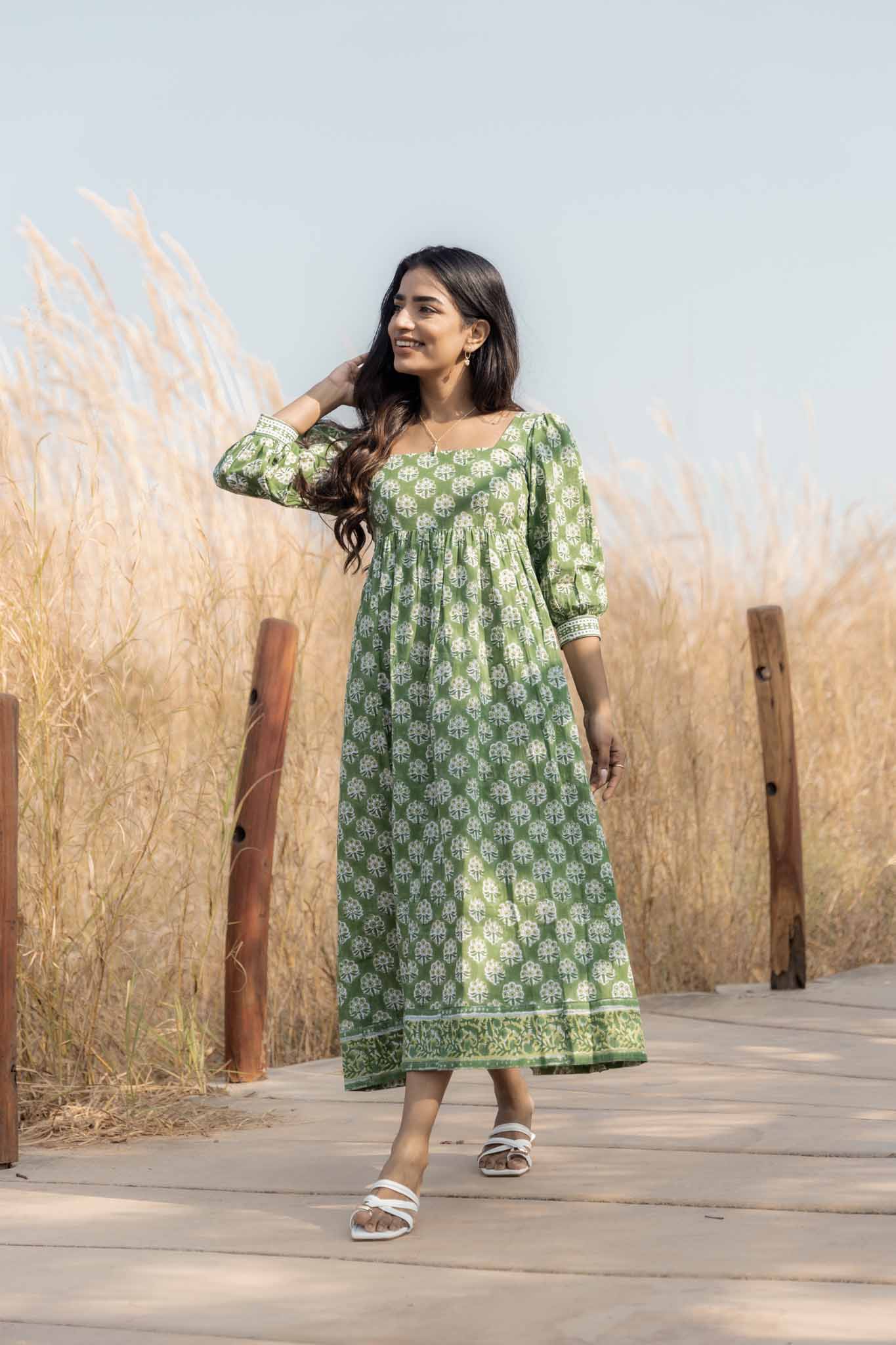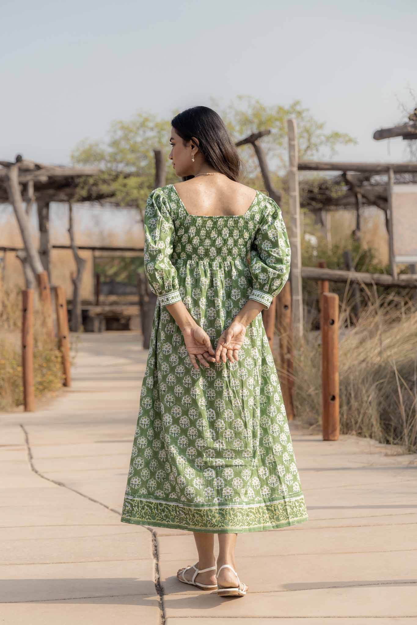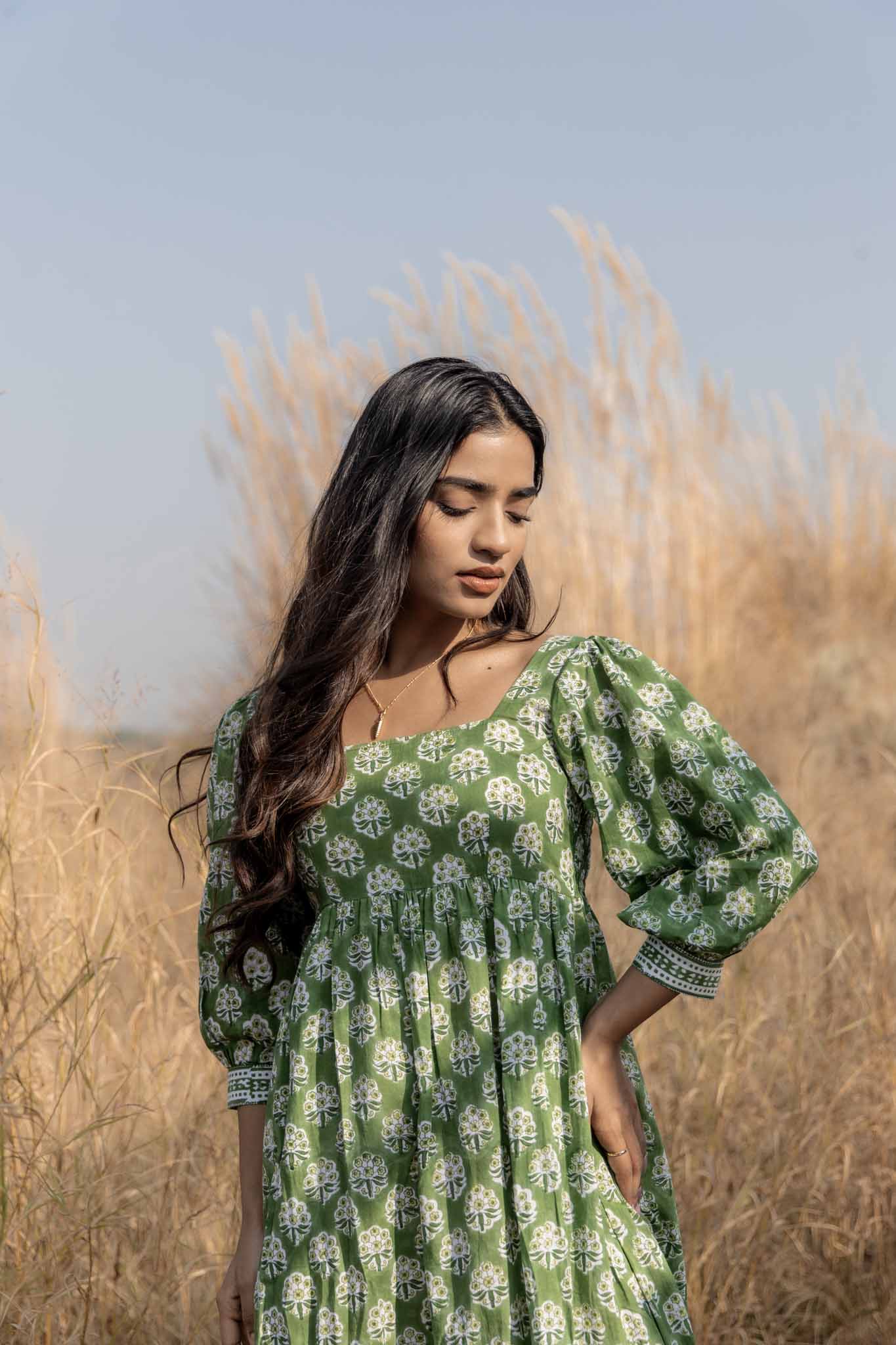 Fresh, feminine, and effortlessly graceful — Peppermint Petal is a handmade maxi dress crafted in breathable cotton, perfect for everyday wear and warm-weather moments. Featuring a harmonious blend of traditional block print and delicate screen printing, the soft green base is adorned with floral motifs that feel both timeless and refreshing.