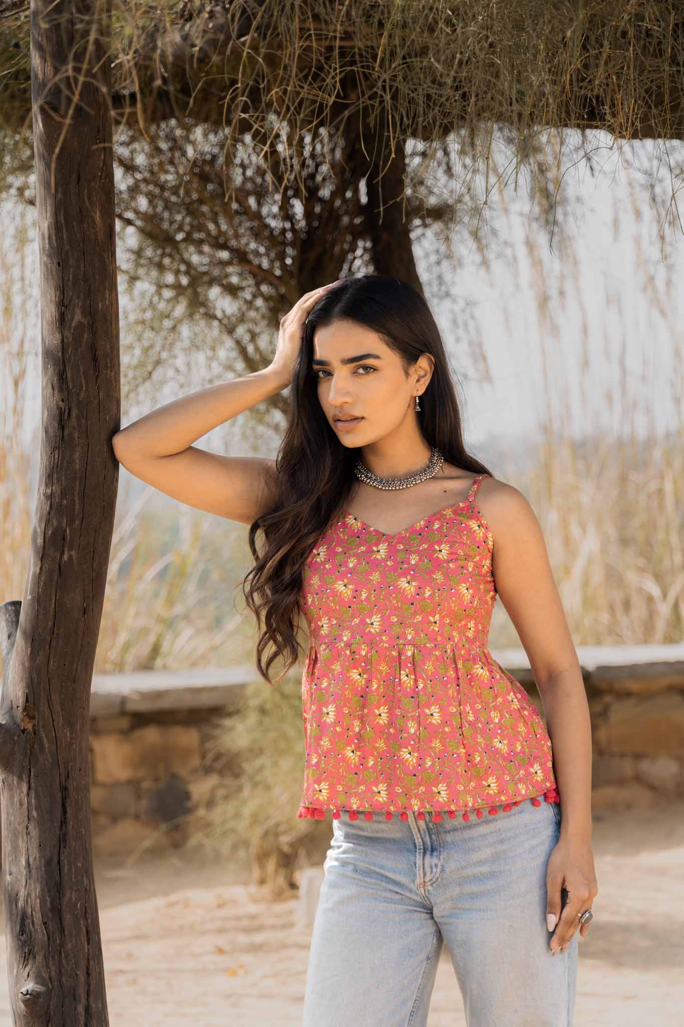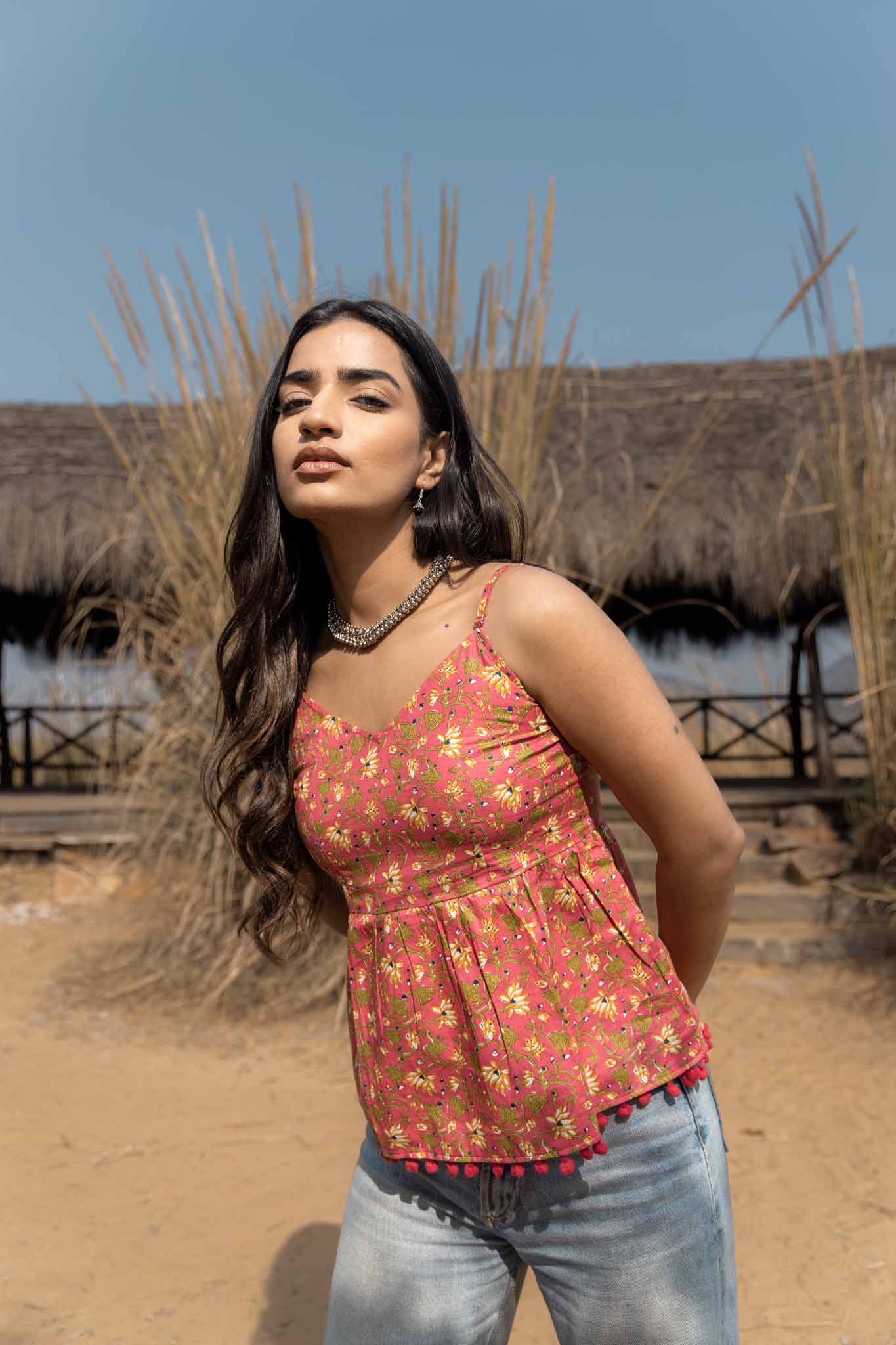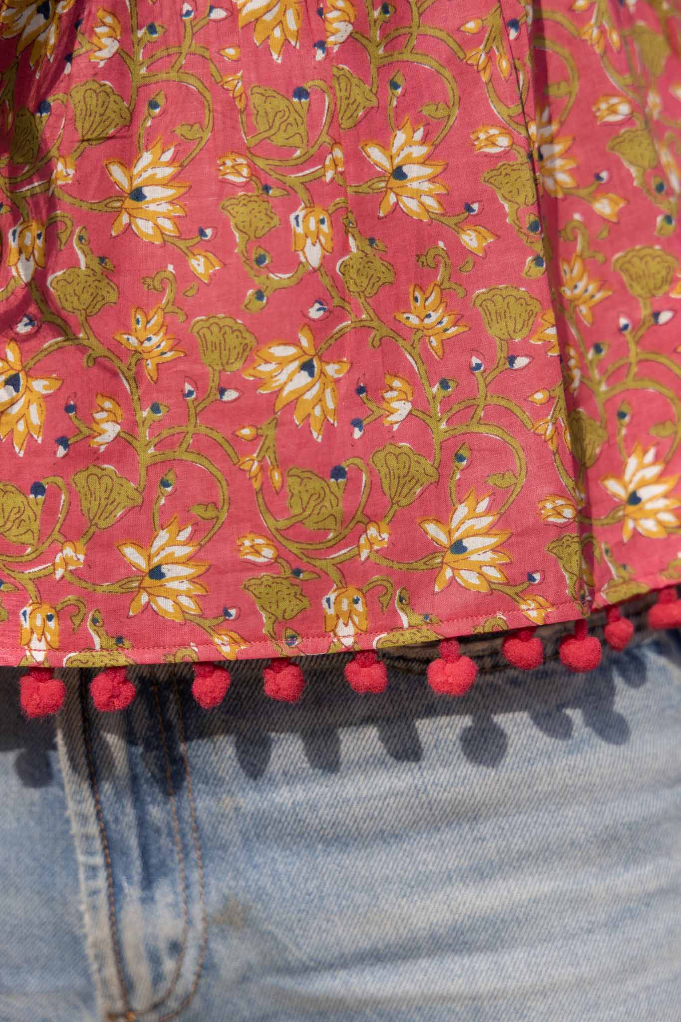 Bold, playful, and full of character — Berry Night is a handmade cotton top designed to brighten everyday looks. Featuring a rich berry-pink base with delicate floral block prints, this piece feels lively yet balanced, making it an easy standout for warm-weather dressing.