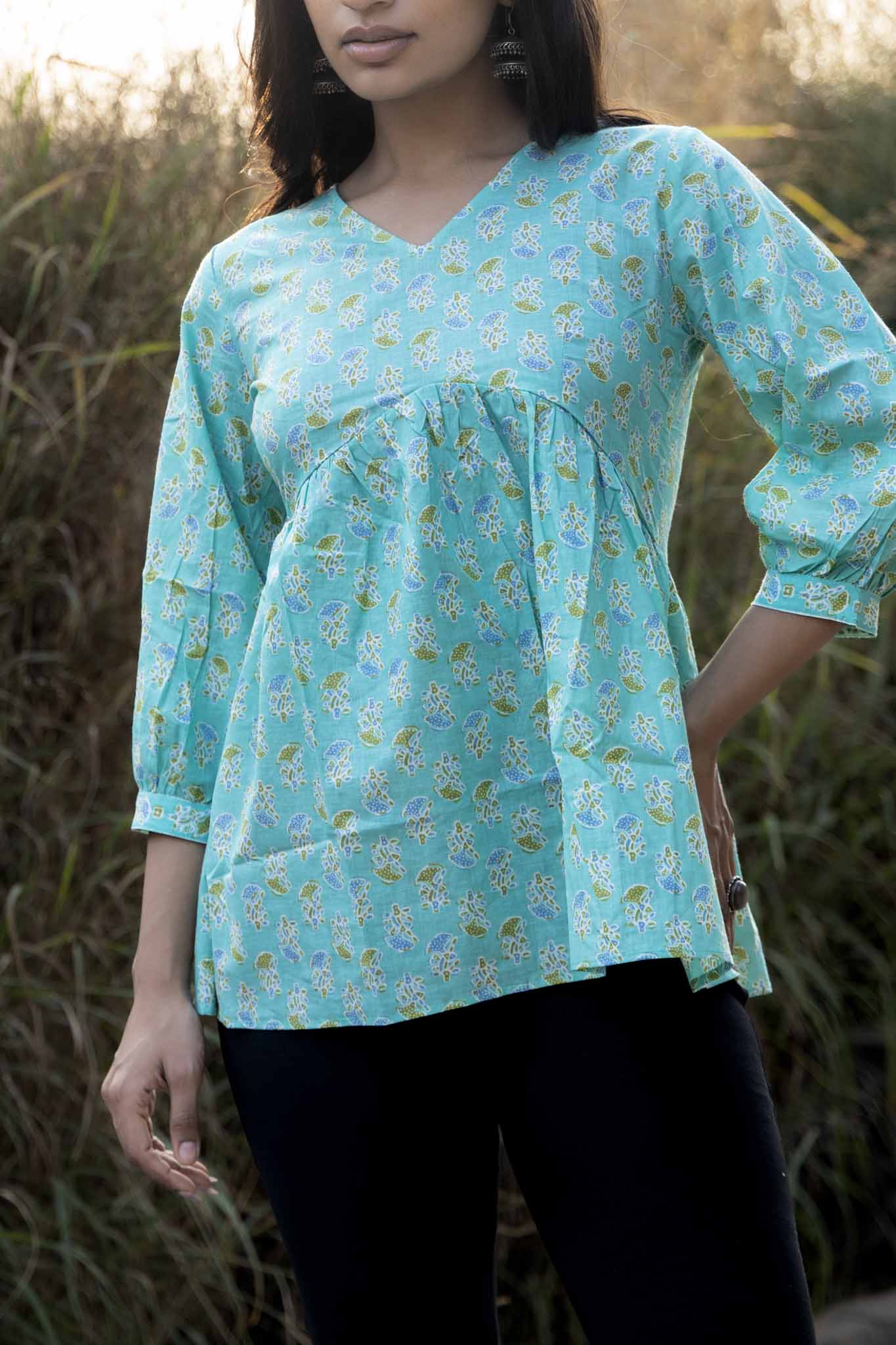 Fresh, light, and effortlessly calming — Morning Dew is a handmade cotton top designed for easy, everyday comfort. Featuring a soft aqua-mint base with delicate hand block motifs, this piece feels airy and soothing, perfect for warm days and relaxed dressing.