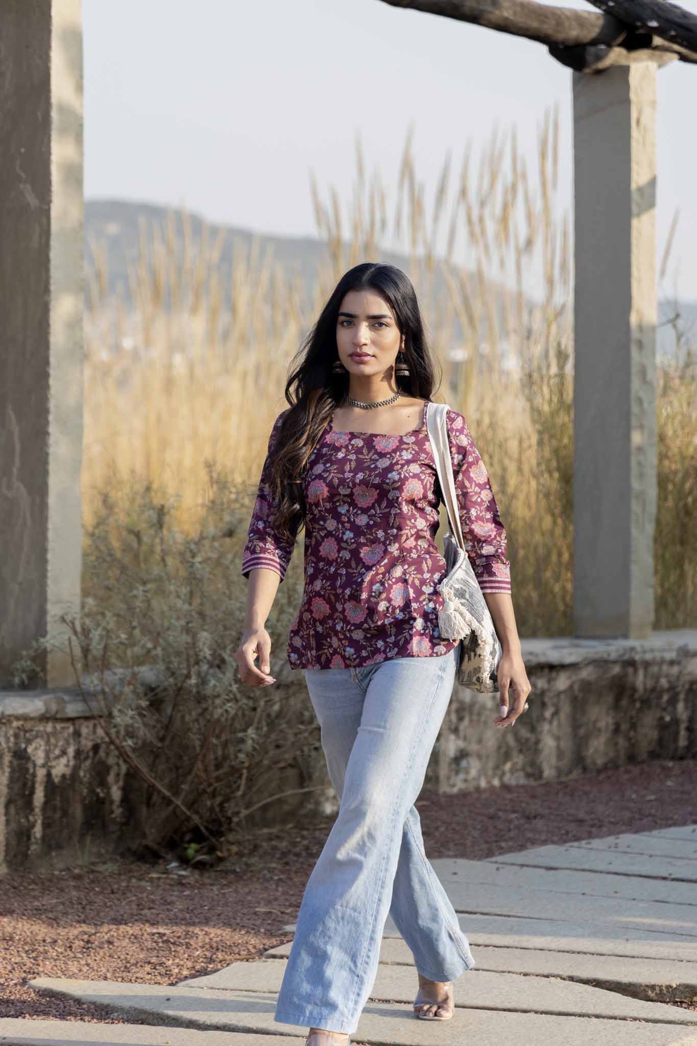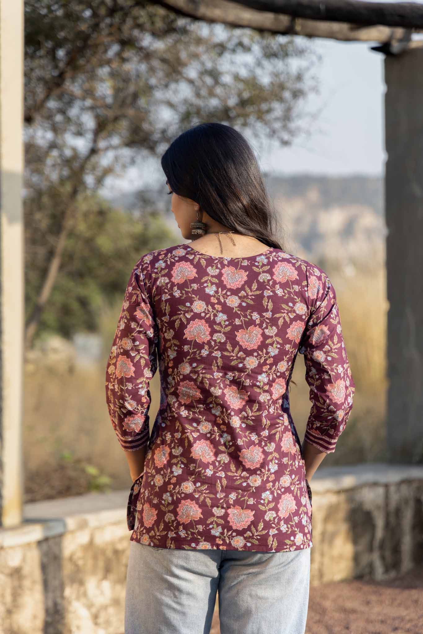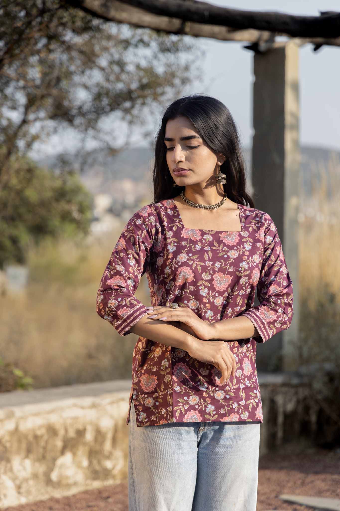 Rich, romantic, and effortlessly timeless — Cranberry Kiss is a handmade cotton top designed for comfort with quiet elegance. Featuring a deep cranberry base adorned with delicate floral block prints, this piece feels warm and refined, perfect for both casual days and dressed-up moments.