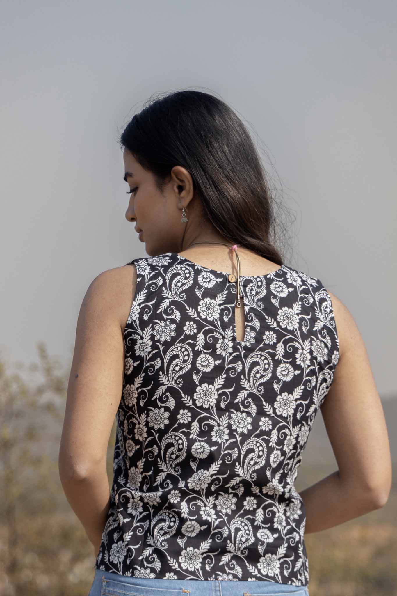 Classic, understated, and endlessly versatile — Winter Lace is a handmade cotton top designed for effortless everyday wear. Featuring a deep black base adorned with intricate white floral block prints, this piece brings a quiet elegance that feels timeless and easy to style.